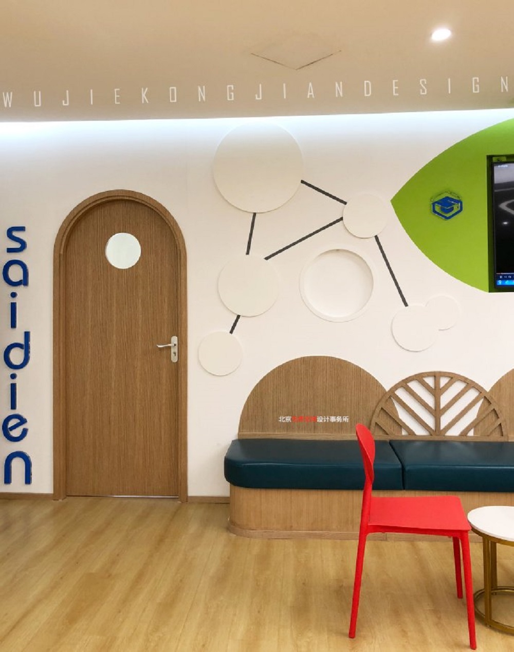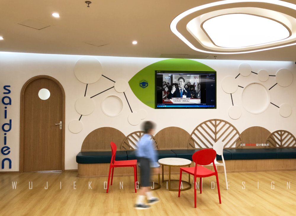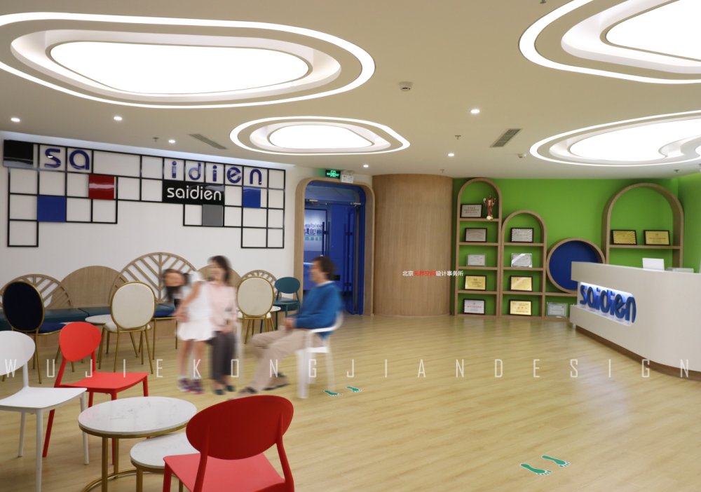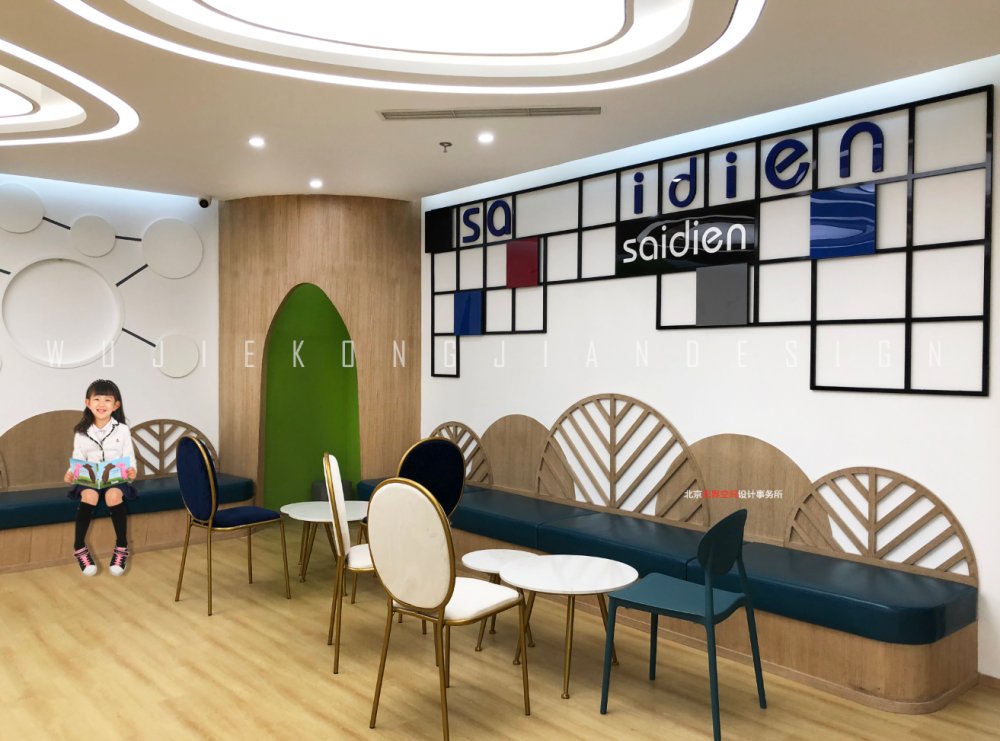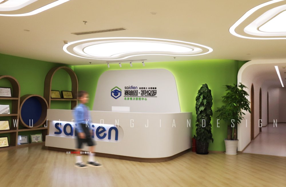 賽迪恩是一家連鎖形式的教育機構,主題色多以綠色為主,綠色象征生命,能夠使人心情愉悅,這也正是企業青少年教育的人心所向。墻面使用環保乳膠漆和3D壁紙營造整個空間氛圍,地面以原木色和白色木地板為主,起到降噪和耐用的同時也豐富了地面的區域劃分。