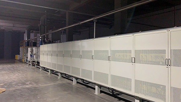 通過高壓水泵將制備好的純水輸送到扇形噴嘴,扇形噴嘴對熔噴進行水刺噴射,通過純水和熔噴布摩擦產(chǎn)生電荷,完成水刺駐極。