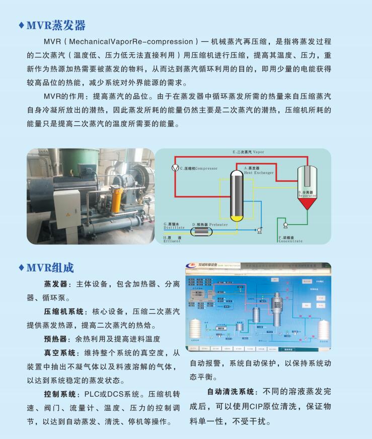 mvr蒸發(fā)器設備由加熱器、強制循環(huán)泵、蒸發(fā)分離器、結晶器、冷凝器、各種物料泵、冷凝水泵、真空泵、操作平臺、電器儀表控制柜及界內(nèi)管道閥門等成。